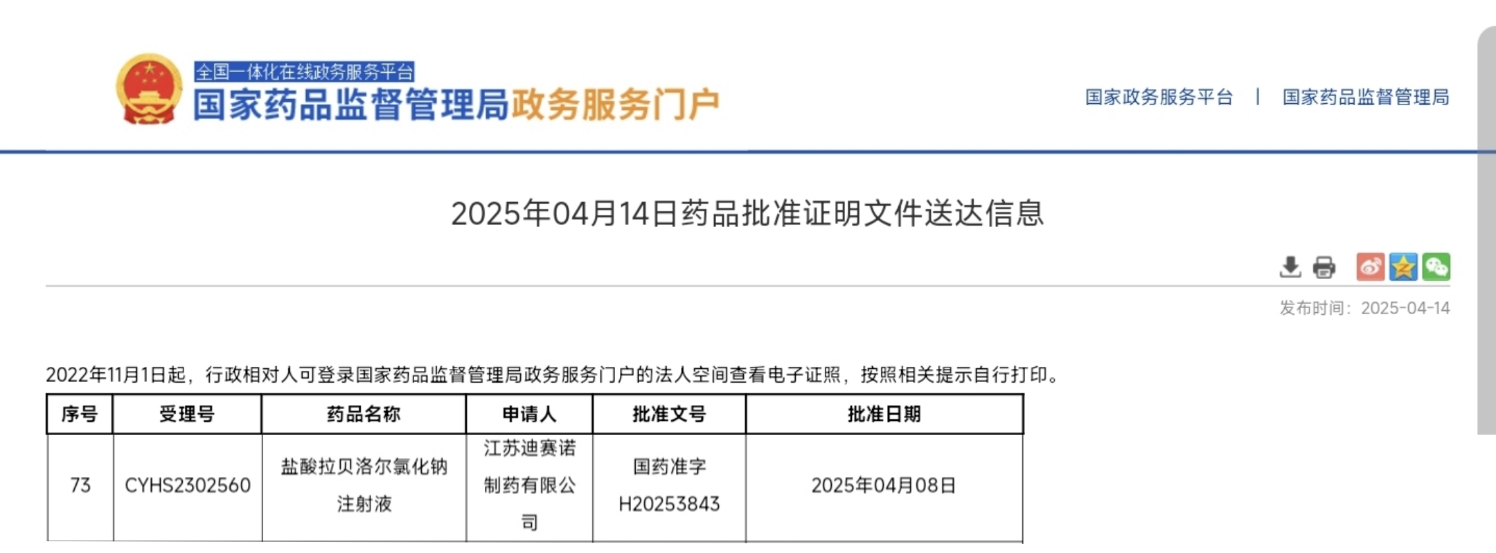 2025年4月8日,万象城在线登录的盐酸拉贝洛尔氯化钠注射液(国药准字H20253843)成功获得国家药品监督管理局(NMPA)批准上市,该产品是公司的化药3类仿制药,是该品种药物的国内首仿。这一成果标志着公司在心血管领域的产品布局迈上新台阶,也为广大患者提供了更优质的用药选择。
